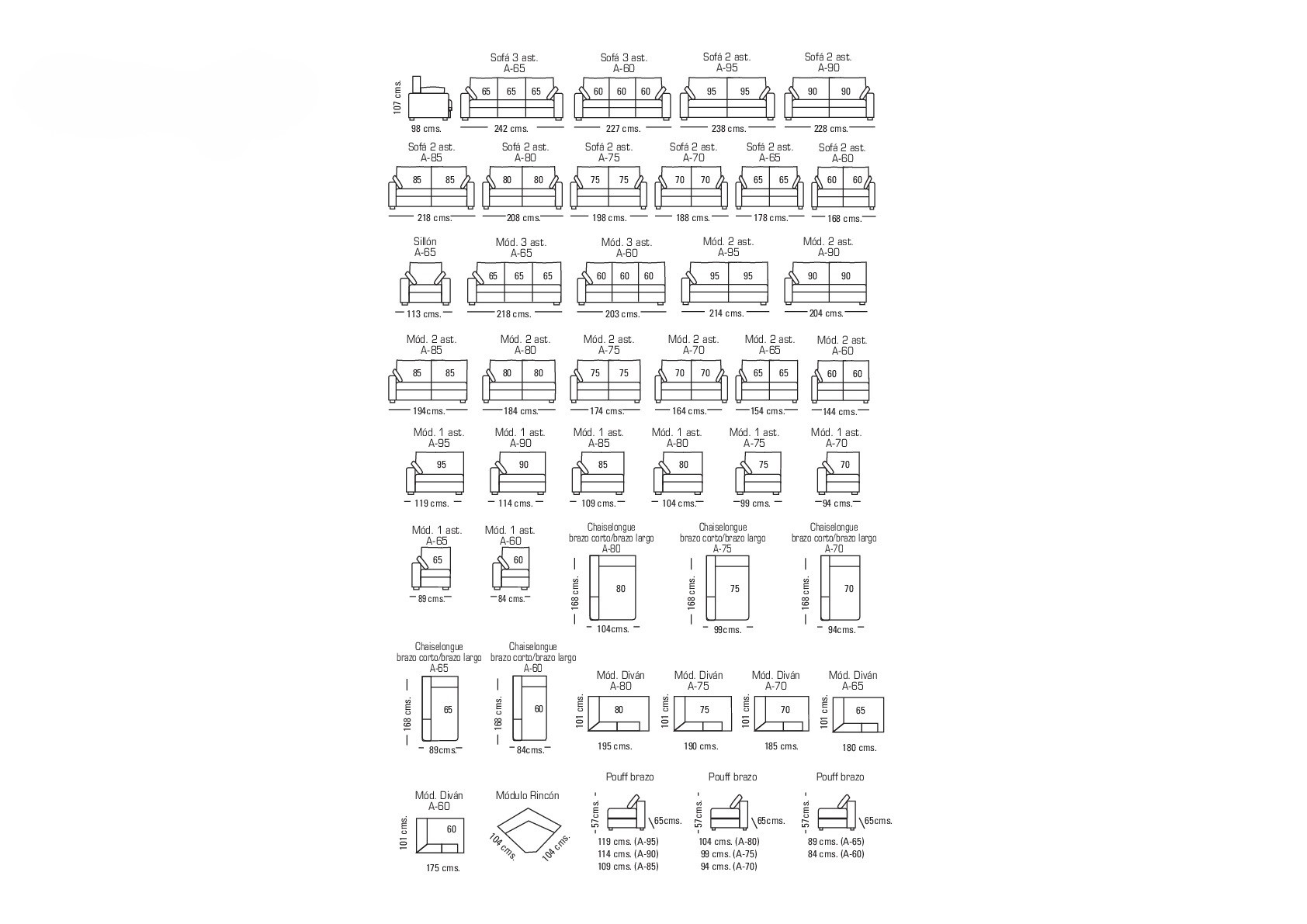 • En los módulos chaiselongue o diván, la medida de fondo solo se podrá modificar en -10 cms o -15 cms, cualquier modificación de estas dos medidas, tendrá un incremento.
